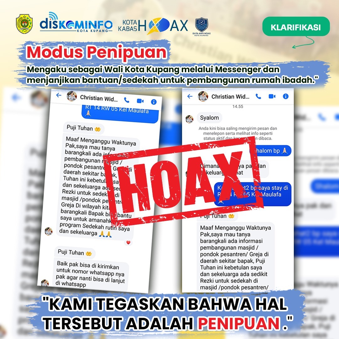 Pemerintah Kota Kupang menegaskan bahwa segala bentuk komunikasi resmi dari Wali Kota tidak dilakukan melalui akun pribadi yang tidak terverifikasi, apalagi dengan meminta atau menjanjikan bantuan secara langsung melalui pesan pribadi.